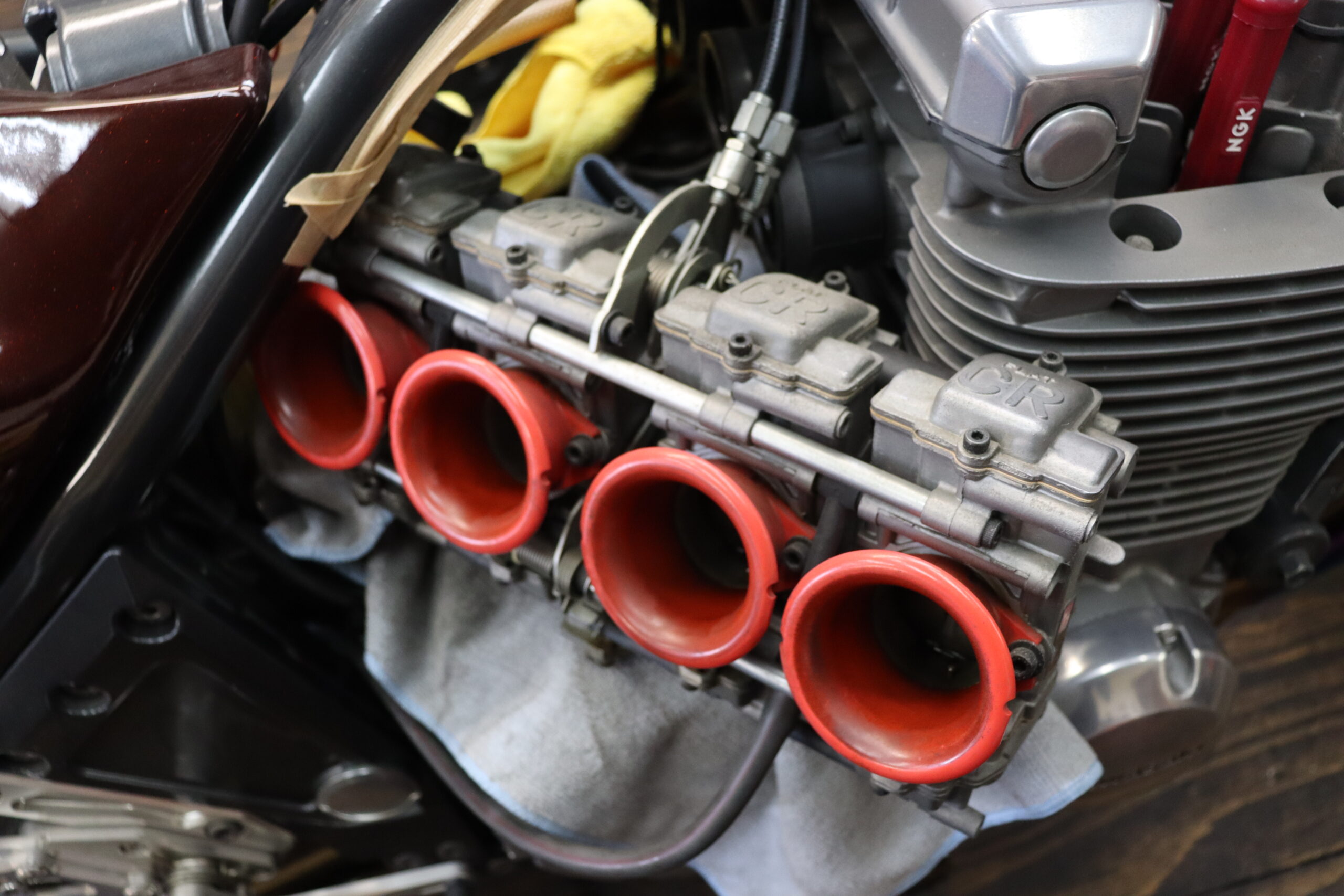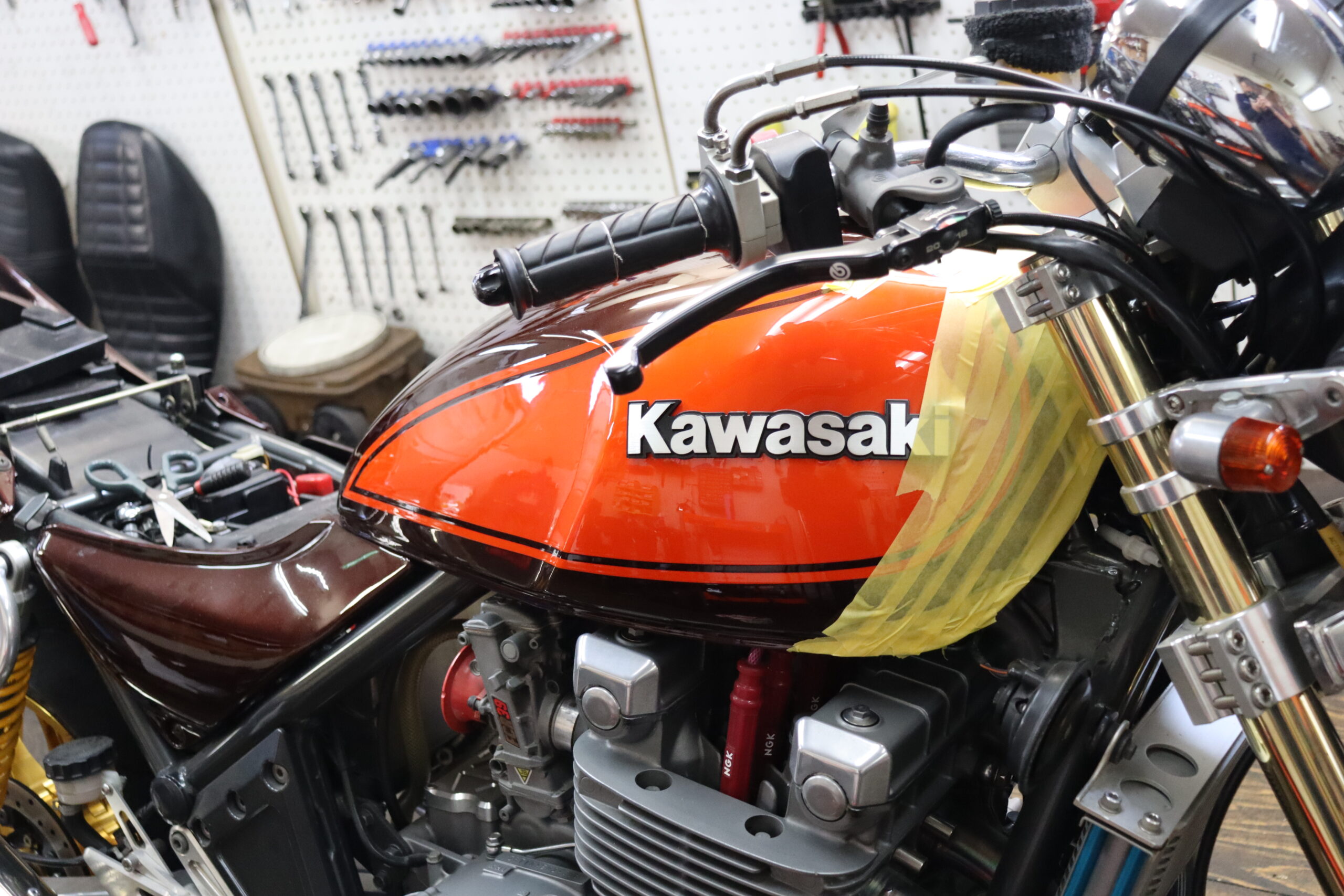 T様ゼファー1100 整備始めますかね タンクが傷つかないように養生します カワサキのって、フレームに当たりやすいですよね・・