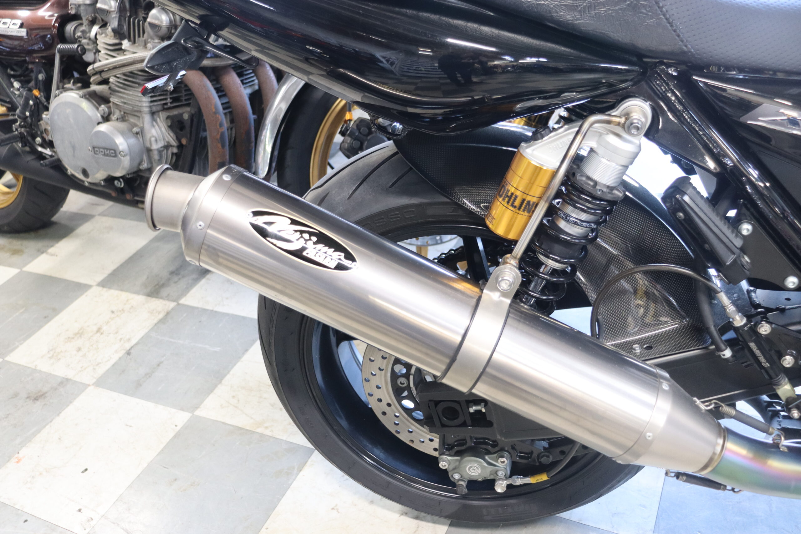ノジマのチタンマフラー・ゲイルスピードホイール・前後オーリンズサスペンション・バックステップ